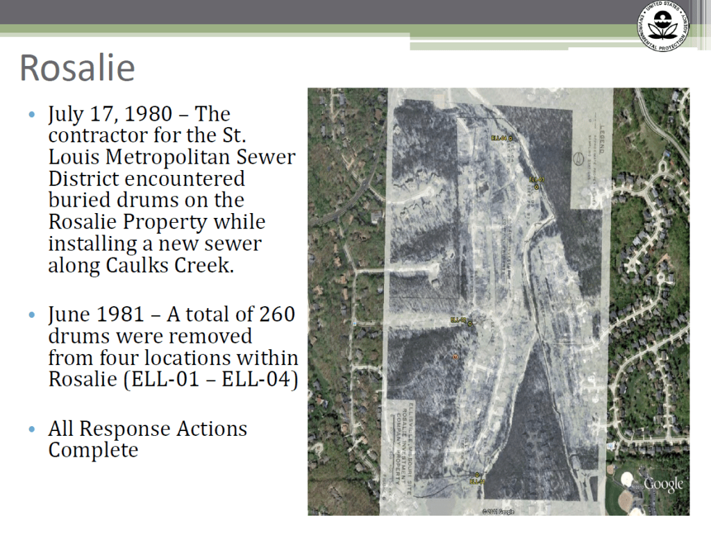 1980, July 7 – Drums were discovered on the Rosalie property by an MSD employee installing a sewer line. The drums were reported to the MDNR and EPA with the EPA responding the same day. Investigation by MDNR indicated a potential serious threat to the public health and the environment. The Rosalie property is a separate site in Wildwood and is noncontiguous with the Callahan property. (EPA Record of Decision 1985)